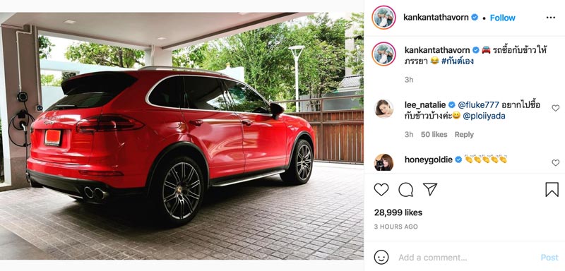 โดยรถคันดังกล่าวนั้น หนุ่มกันต์ ยังบอกไว้ด้วยว่าเป็น "รถซื้อกับข้าวให้ภรรยา #กันต์เอง" ซึ่งซื้อกับข้าวของภรรยานั้นก็ไม่ธรรมดา เพราะเป็นรถ SUV สุดหรูยี่ห้อดังอย่าง Porsche รุ่น Cayenne ที่สนนราคาเริ่มต้นอยู่ที่ 6.6 ล้านบาท แถมยังเลือกสีแดงแรงฤทธิ์ สวยเฉี่ยวเหมาะกับความปังของคู่เลิฟมาก ๆ