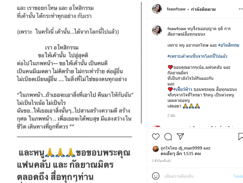 พร้อมทั้งระบุอีกว่า "หนูจึงขออนุญาต ยุติ การสัมภาษณ์สื่อทุกแขนง เพราะหนูอยากยกโทษ และ #อโหสิกรรม #เพราะเขาคนนั้นจากโลกนี้ไปแล้ว ขอบคุณมาก ๆ เน้อ แฟนคลับและกัลยาณมิตรที่เป็นกำลังใจให้กันและกัน และ #เฟี้ยว์ฟ้าว ขอบพระคุณ สื่อทุกแขนงจริง ๆ จากใจที่โทร. มา รักหนู เป็นห่วงหนู เมตตาต่อหนู เสมอมา"
