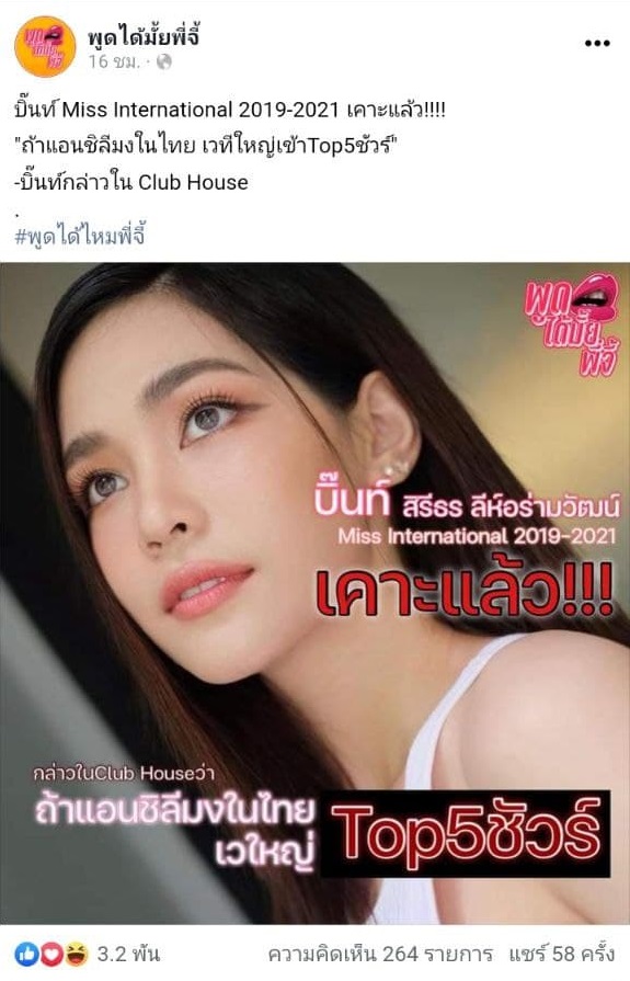 ต้องบอกว่าเวทีการประกวด Miss Universe Thailand 2021 กำลังสนุกเข้มข้นเลยทีเดียว เพราะในหมู่แฟนนางงามก็มีการตั้งห้องแลกเปลี่ยนความคิดเห็นกันผ่านโลกออนไลน์กันอย่างคึกคัก ขนาดนางงามรุ่นพี่อย่าง บิ๊นท์ สิรีธร ลีห์อร่ามวัฒน์ นางสาวไทย 2562 และนางงามนานาชาติ 2019 ยังเข้ามาร่วมพูดคุยในคลับเฮาส์ด้วย