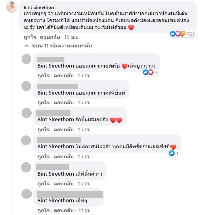 อย่างไรก็ตาม บิ๊นท์ สิรีธร มาคอมเมนต์สยบดราม่าว่า "เคาะสนุก ๆ จ้า แฟนนางงามเหมือนกัน ในคลับเฮาส์ยังบอกเลยว่าน้องรุ่นนี้เด่นคนละทาง ใครมงก็ได้ แต่เข้าห้องน้องแอน ก็เลยพูดถึงน้องและคอนเซ็ปต์น้องนะจ๊ะ ใครได้ก็ยินดีเหมือนเดิมม จะเจิมให้ด้วย"