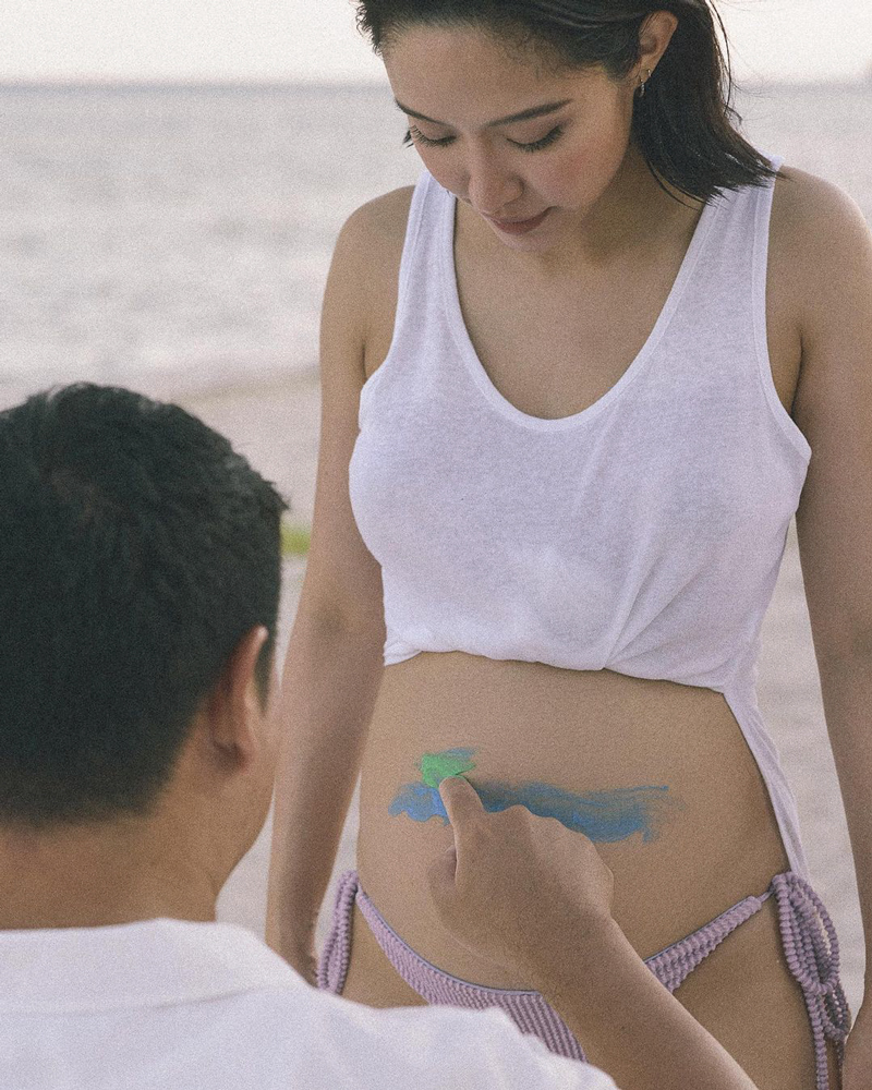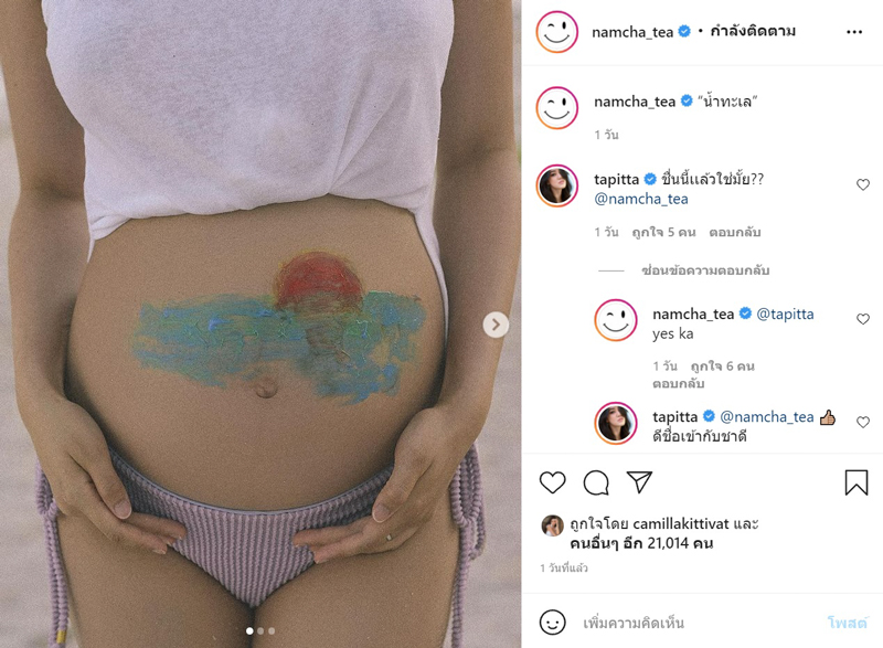นอกจากนี้ยังมีภาพที่สื่อความหมายเป็นชื่อของลูกด้วย หลังคุณพ่อใช้สีวาดภาพทะเลกับพระอาทิตย์ลงไปบนหน้าท้องของคุณแม่ และเขียนแคปชั่นสั้น ๆ ว่า "น้ำทะเล" ซึ่งพี่สาวในวงการอย่าง พิตต้า ณ พัทลุง ว่าที่คุณแม่เหมือนกัน มีการเข้ามาคอมเมนต์ถามว่า "ชื่อนี้แล้วใช่ไหม ?" สาวน้ำชาก็เข้ามาตอบแบบกระจ่างชัดว่า "Yes ka"