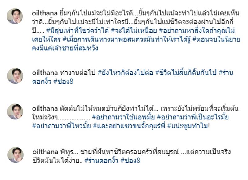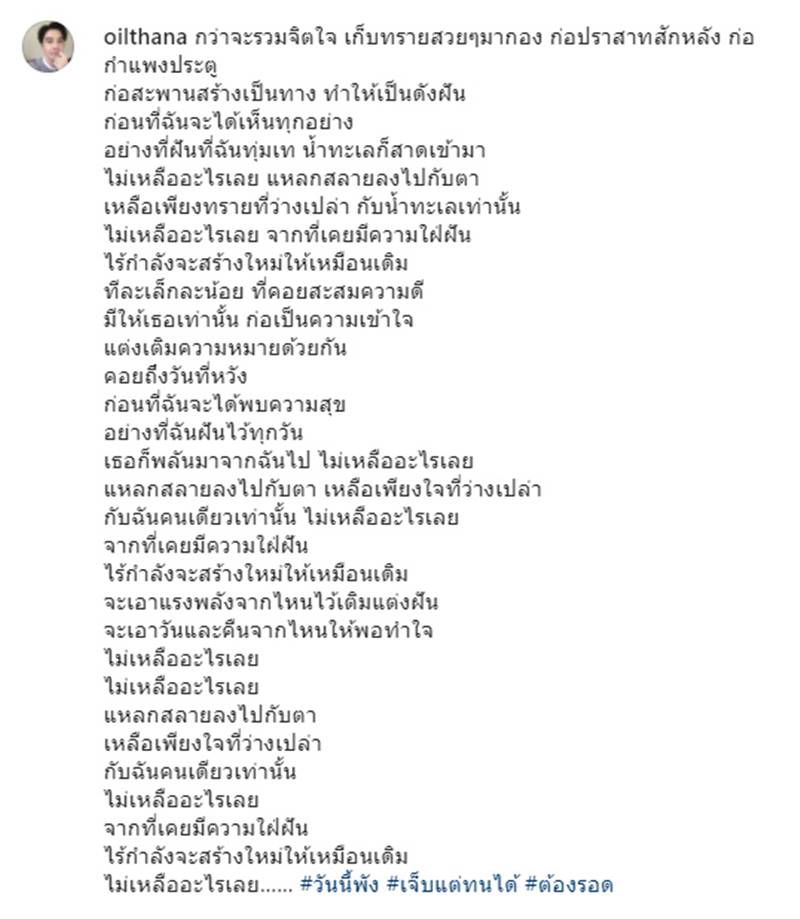 ล่าสุด (16 ตุลาคม 2564) เมื่อเข้าไปส่องไอจีฝั่ง ออย ธนา พบว่าเจ้าตัวโพสต์แคปชั่นเหมือนคนกำลังเศร้า ข้อความแนวตัดพ้อหลายโพสต์ แถมยังมีเนื้อเพลง “ปราสาททราย” อีกด้วย อาทิ