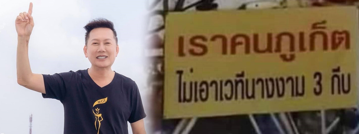 ถ้าป้ายนี้หมายถึงเวทีมิสแกรนด์ช่วยเปลี่ยนป้ายให้หน่อยครับ หรือใช้ป้ายเดิมก็ได้ลบคำว่า 3 กีบ เปลี่ยนเป็นไม่เอาเวทีนางงามประชาธิปไตย ไม่ศึกษาผิดพลาดเรียนรู้กันใหม่ได้ครับ ผมเข้าใจครับแล้วพบกันที่ภูเก็ตครับ ขอบคุณเครดิตตามภาพ"