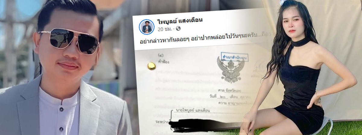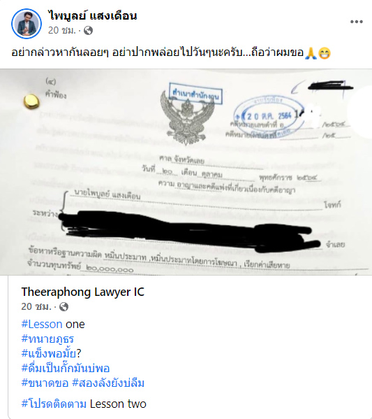 นอกจากนี้ ยังได้แชร์เอกสารฟ้องของทนายความ ซึ่งปรากฏชื่อครูไพบูลย์ แสงเดือน เป็นโจทย์ ข้อหาหมิ่นประมาท และหมิ่นประมาทด้วยการโฆษณา เรียกค่าเสียหายจำนวน 20 ล้านบาท แต่ยังคงปิดชื่อจำเลยเอาไว้