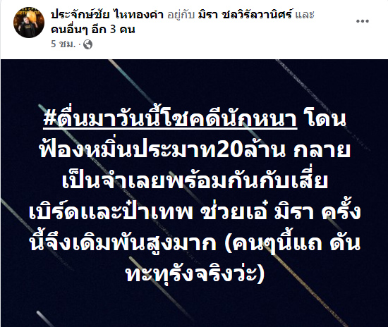 ขณะที่ เอ๋ มิรา เข้ามาคอมเมนต์ตอบกลับว่า “อาจารย์คะ หนูขอโทษเด้อค่ะ” ก่อนที่ประจักษ์ชัยจะตอบว่า “ทำใจให้สบาย ๆ เชื่อในความดี”