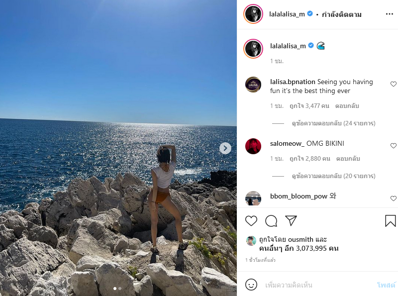 ล่าสุด (21 ตุลาคม 2564) ลิซ่า ก็ทำเอาแฟนคลับแตกตื่น หลังออกมาโพสต์ภาพอวดความแซ่บในชุดว่ายน้ำเป็นครั้งแรก กับภาพสวมชุดบิกินี่ตัวจิ๋ว สวมทับด้วยเสื้อยืดแบบชิค ๆ ยืนโพสท่าปัง ๆ แบบ Sexy girl โชว์เรียวขายาวอยู่บนโขดหิน เรียกว่าเห็นแค่ข้างหลังก็รู้เลยว่าต้องแซ่บเว่อร์ แถมยังสวยซน ดูสดใส และเท่ลงตัวสุด ๆ