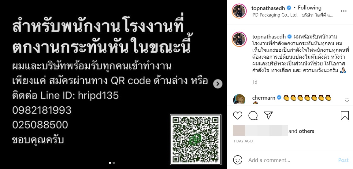 "ผมพร้อมรับพนักงานโรงงานที่กำลังตกงานกะทันหันทุกคน ผมเห็นใจและขอเป็นกำลังใจให้พนักงานทุกคนที่ต้องเจอการเปลี่ยนแปลงไม่ทันตั้งตัว หวังว่าผมและบริษัทจะเป็นส่วนนึงที่ช่วย ให้โอกาส กำลังใจ ทางเลือก และความหวังนะครับ"