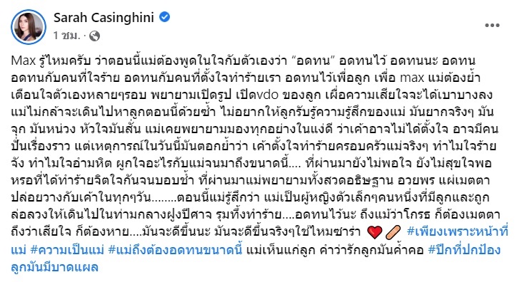 ทำเอาหลายคนเป็นห่วงและสงสัยว่าเกิดอะไรขึ้น เมื่อล่าสุด (22 ตุลาคม 2564) คุณแม่คนสวย ซาร่า คาซิงกินี ออกมาโพสต์ภาพคู่ลูกชาย น้องแม็กซ์เวลล์ พร้อมข้อความในทำนองว่าตอนนี้ต้องบอกตัวเองให้อดทนกับคนที่ใจร้าย ตั้งใจทำร้ายเรา ต้องอดทนไว้เพื่อลูก โดยข้อความทั้งหมดมีดังนี้