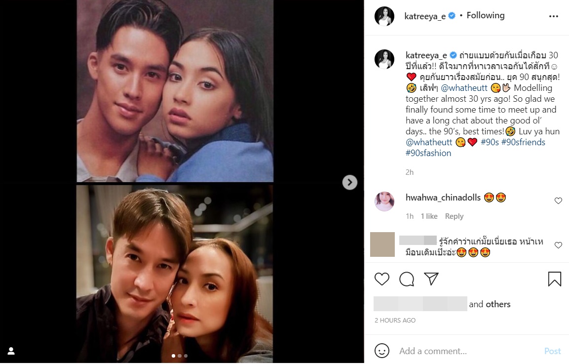 แคทรียา อิงลิช ถ่ายภาพคู่ อั๊ต อัษฎา ท่าโพสเดียวกับสมัยถ่ายแบบด้วยกันเมื่อเกือบ 30 ปีก่อน ทำแฟน ๆ กดไลก์กันรัว ๆ แม้อายุเลข 4 แล้ว แต่ยังงานดีทั้งคู่