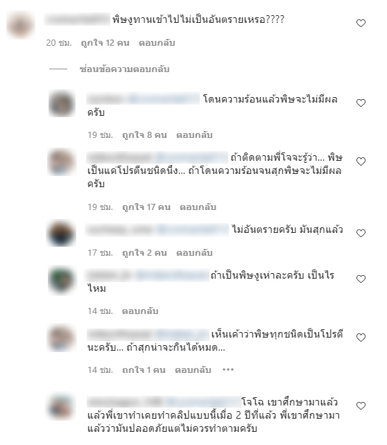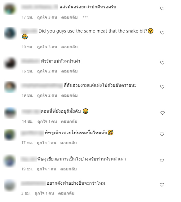 ขณะที่มีคนเข้ามาถามหลายคนว่ากินพิษงูเข้าไปไม่เป็นอันตรายเหรอ ซึ่งมีคนมาให้ข้อมูลว่า โจโฉเคยทำคลิปแบบนี้ ซึ่งเขาศึกษามาแล้วว่าพิษงูเป็นโปรตีน เมื่อสุกแล้วสามารถกินได้ แต่ก็มีหลายคนที่บอกว่าดูคลิปแล้วขนลุกมากและไม่กล้ากินเมนูดังกล่าว