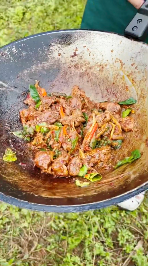 ทั้งนี้ โจโฉบอกว่าปกติแล้วเขี้ยวงูจะพับอยู่ ตัวนี้เขี้ยวว่า 1-2 เซนติเมตร ถ้าเราเอาเนื้อเข้ามาใกล้ งูจะกัดและปล่อยพิษทันที จากนั้นก็จับงูเข้าไปใกล้เนื้อหมูป่าที่เตรียมมา งูก็อ้าปากงับเนื้อทันทีและปล่อยพิษใส่เนื้อหมูป่า ก่อนที่จะบ่นเบา ๆ ว่าเนื้อหมูชิ้นใหญ่ไปหน่อยทำให้งูกัดไม่ถนัด เมื่องูปล่อยพิษใส่เนื้อหมูป่าแล้วก็ปล่อยงูพักผ่อนในกรงตาข่าย จากนั้นก็ลงมือตั้งกระทะผัดเผ็ดจนเสร็จเรียบร้อย