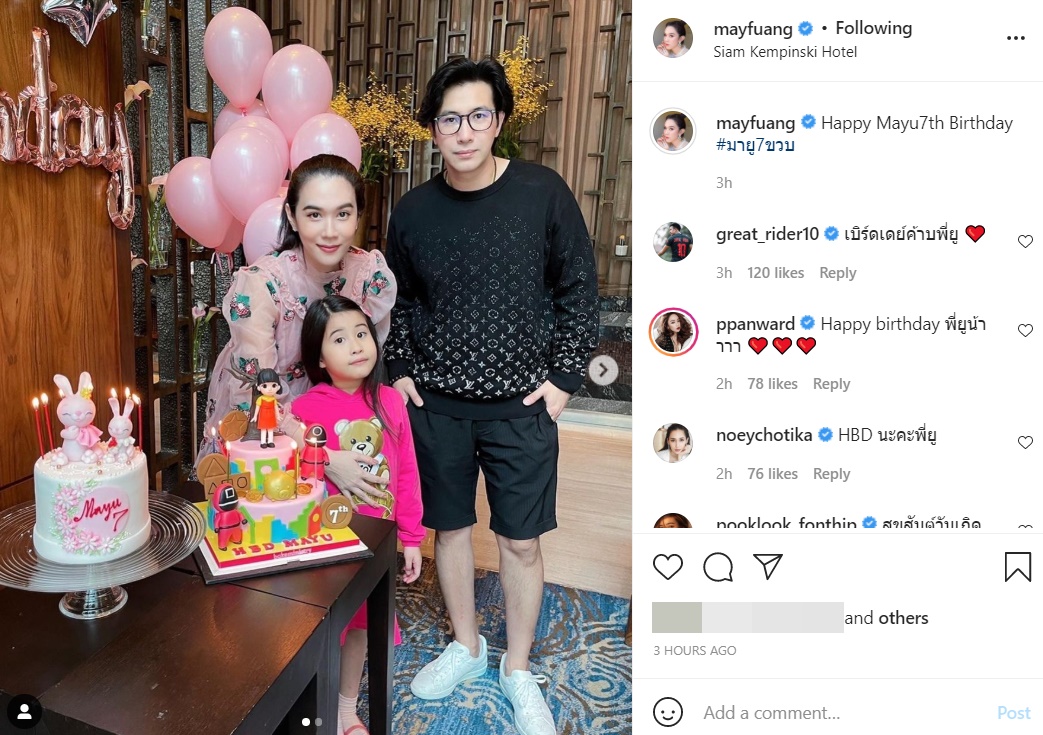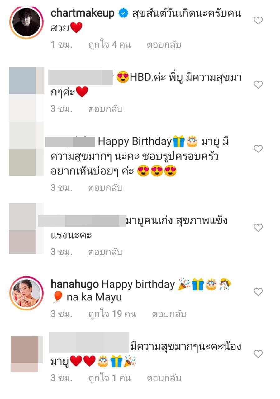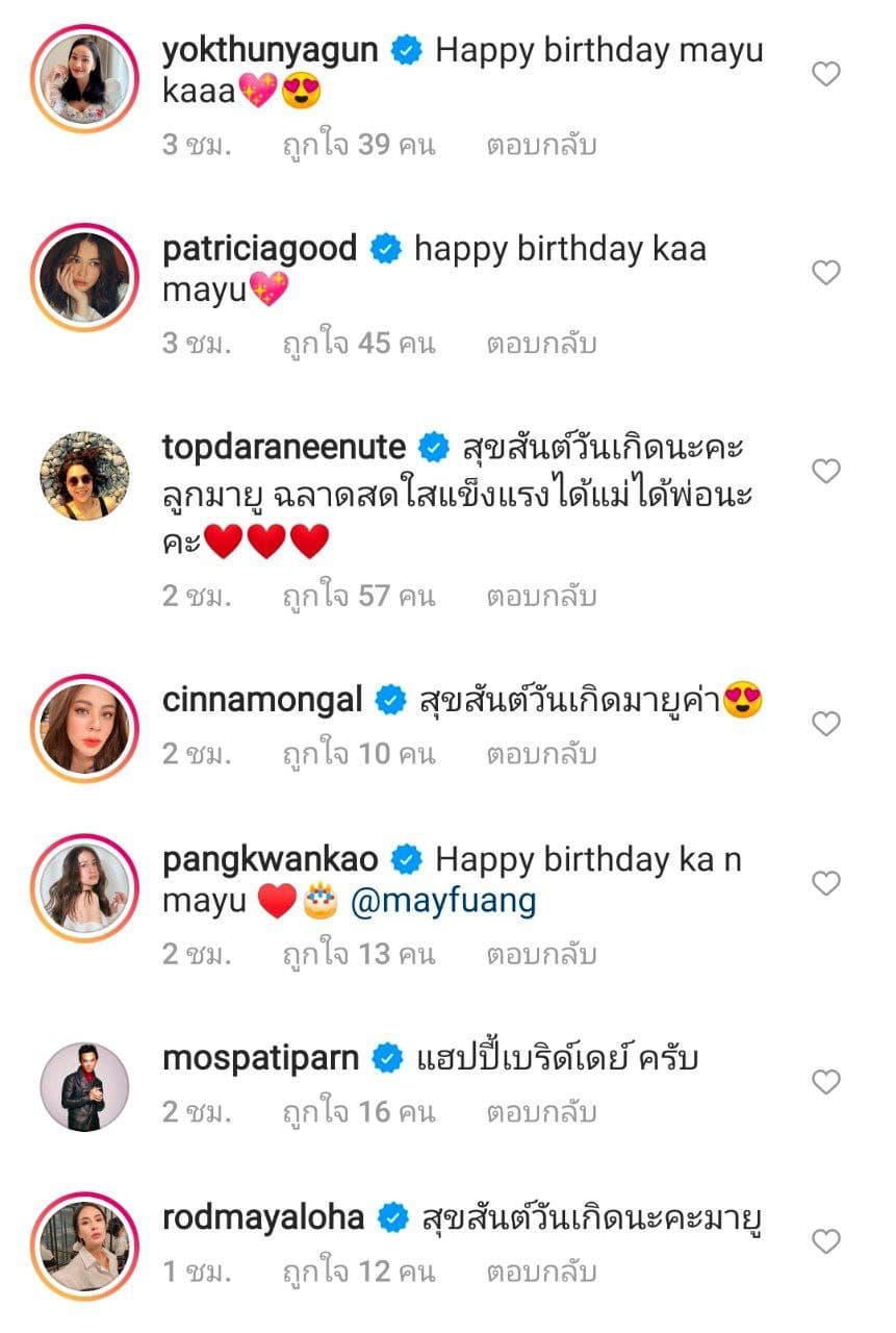 งานนี้ก็มีบรรดาพี่ ป้า น้า อา เพื่อน ๆ ในวงการของพ่อหนุ่ม - แม่เมย์ และแฟน ๆ เข้ามาคอมเมนต์ร่วม HBD น้องมายู กันอย่างคับคั่ง