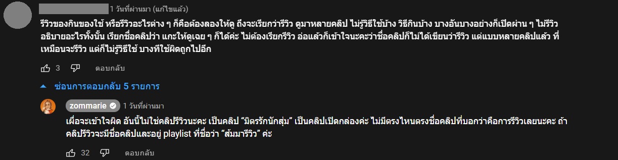 ขณะที่ ส้ม มารี เข้ามาชี้แจงว่า นี่ไม่ใช่คลิปรีวิว แต่เป็นคลิปเปิดกล่อง ถ้าคลิปรีวิวก็จะเขียนชื่อคลิปชัดเจนว่ารีวิว ถ้าเปิดกล่องสุ่มก็จะประมาณนี้ รายการ "มิตรรักนักสุ่ม" เป็นคลิปเปิดกล่อง ไม่มีตรงไหนที่บอกว่านี่คือการรีวิวเลย ถ้าคลิปรีวิวจะมีชื่อคลิปว่า "ส้มมารีวิว"
