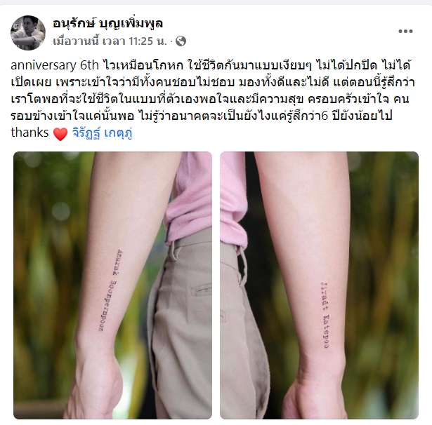 "anniversary 6th ไวเหมือนโกหก ใช้ชีวิตกันมาแบบเงียบ ๆ ไม่ได้ปกปิด ไม่ได้เปิดเผย เพราะเข้าใจว่ามีทั้งคนชอบไม่ชอบ มองทั้งดีและไม่ดี แต่ตอนนี้รู้สึกว่าเราโตพอที่จะใช้ชีวิตในแบบที่ตัวเองพอใจและมีความสุข ครอบครัวเข้าใจ คนรอบข้างเข้าใจแค่นั้นพอ ไม่รู้ว่าอนาคตจะเป็นยังไง แค่รู้สึกว่า 6 ปียังน้อยไป thanks จิรัฏฐ์ เกตุภู่"