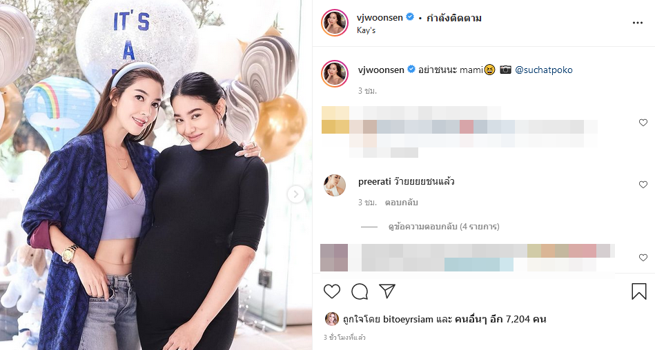 โดยสาววุ้นเส้นก็ได้โพสต์ภาพคู่กับสาวพิตต้าไว้เป็นที่ระลึก ซึ่งมีภาพที่เจ้าตัวได้จับท้องว่าที่คุณแม่ไว้อย่างละมุนเป็นโมเมนต์ที่น่ารักและอบอุ่นมาก แต่ที่ทำเอาแอบหลุดยิ้มก็คือได้ลงแคปชั่นเจ้าตัวว่า "อย่าชนนะ mami"