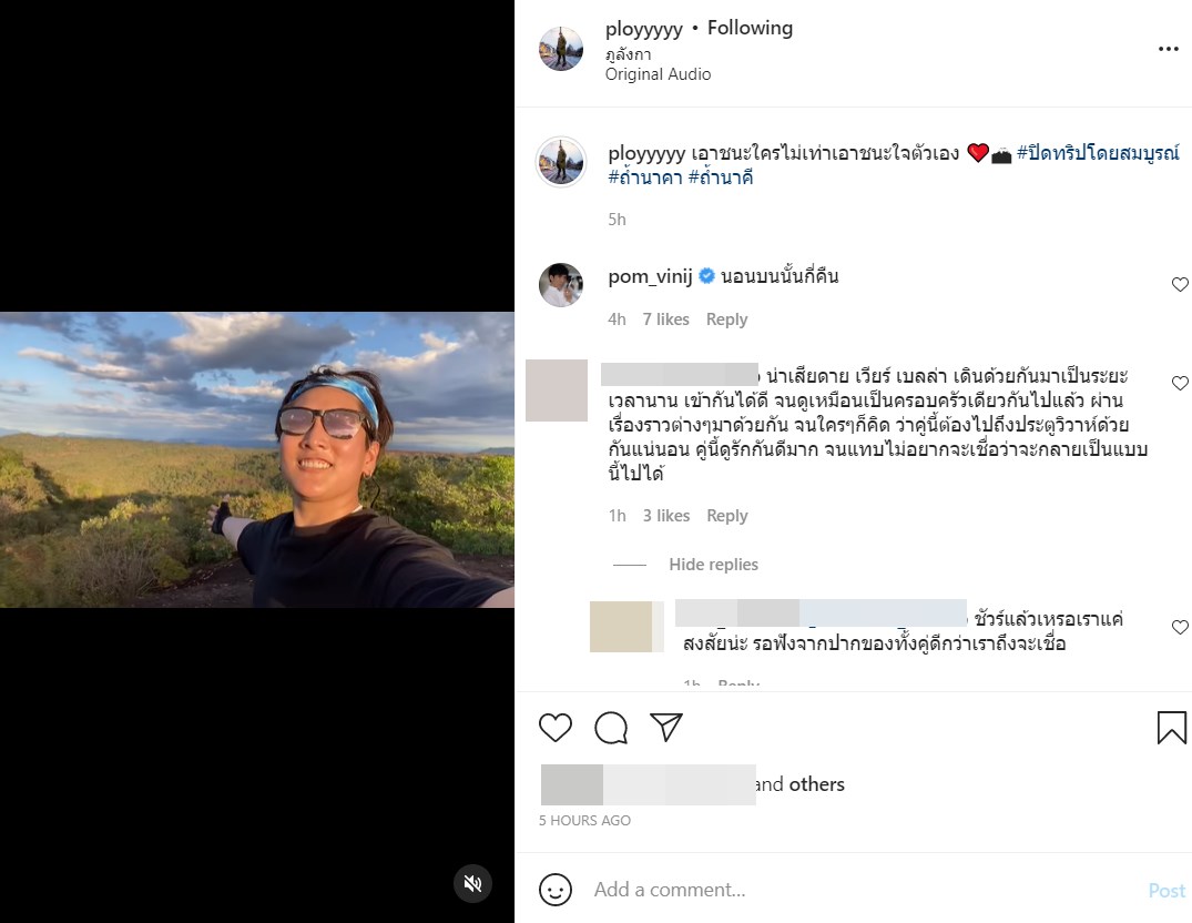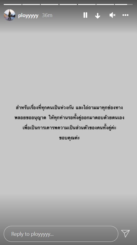 ก่อนที่พลอยจะโพสต์ข้อความสั้น ๆ ลงใน IG Story เกี่ยวกับเรื่องนี้ว่า "สำหรับเรื่องที่ทุกคนเป็นห่วงกัน และไถ่ถามมาทุกช่องทาง พลอยขออนุญาต ให้ทุกท่านรอทั้งคู่ออกมาตอบด้วยตนเอง เพื่อเป็นการเคารพความเป็นส่วนตัวของคนทั้งคู่ค่ะ ขอบคุณค่ะ"