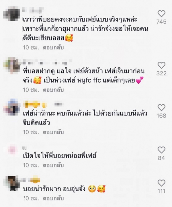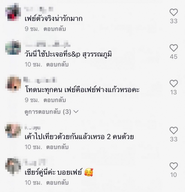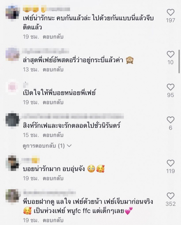 งานนี้ก็มีแฟน ๆ และชาวเน็ต พากันคอมเมนต์เพียบว่า น่ารักมาก แบบนี้น่าจะคบกันแล้วหรือเปล่า เฮียจีบติดแล้ว ล่าสุดเฟย์อัปว่าอยู่กระบี่แล้ว ไปด้วยกันหรือเปล่า บอยน่ารักอบอุ่นมาก เฟย์ตัวจริงน่ารักมาก ฯลฯ