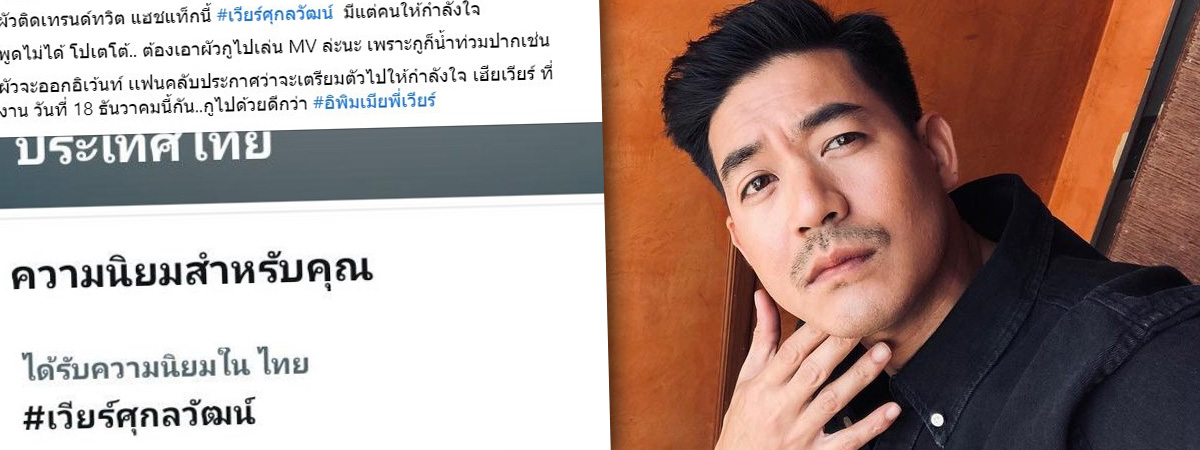 ทำเอาหลายคนสงสัยว่าเกิดอะไรขึ้น เมื่อมีแฮชแท็กชื่อพระเอกหนุ่ม #เวียร์ศุกลวัฒน์ ติดเทรนด์ในทวิตเตอร์ จะเกี่ยวกับประเด็นที่ เวียร์ ศุกลวัฒน์ เพิ่งเลิกรา เบลล่า ราณี หรือเปล่า หรือจะมีข่าวเมาท์เรื่องไหนตามมาอีก เพราะก่อนหน้านี้ก็โดนโยงแบบรัว ๆ