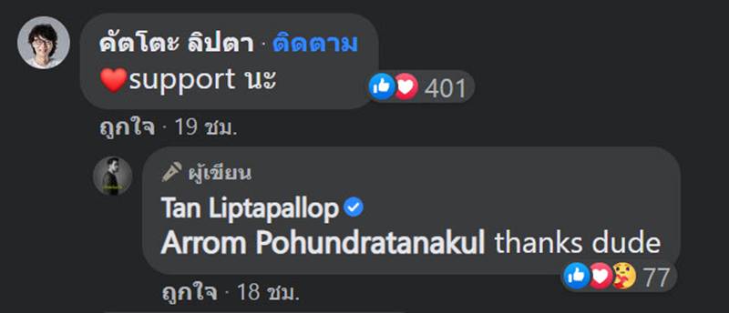 ภายหลังจากที่ แทน ลิปตา ได้โพสต์ออกไป มีผู้คนเข้ามาคอมเมนต์อย่างล้นลาม ไม่ว่าจะเป็นพี่น้องในวงการดนตรี รวมทั้งแฟนคลับอีกจำนวนมากต่างเข้ามาให้กำลังใจศิลปินและโปรดิวเซอร์มากฝีมือรายนี้ เช่น คัตโตะ, โอ๊ต ปราโมท, ว่าน ธนกฤต, อิ้งค์ วรันธร, เบน ชลาทิศ, ว่าน วันวาน, ลูกหว้า พิจิกา, บอล Scrubb, ปาล์ม Chilling Sunday เป็นต้น