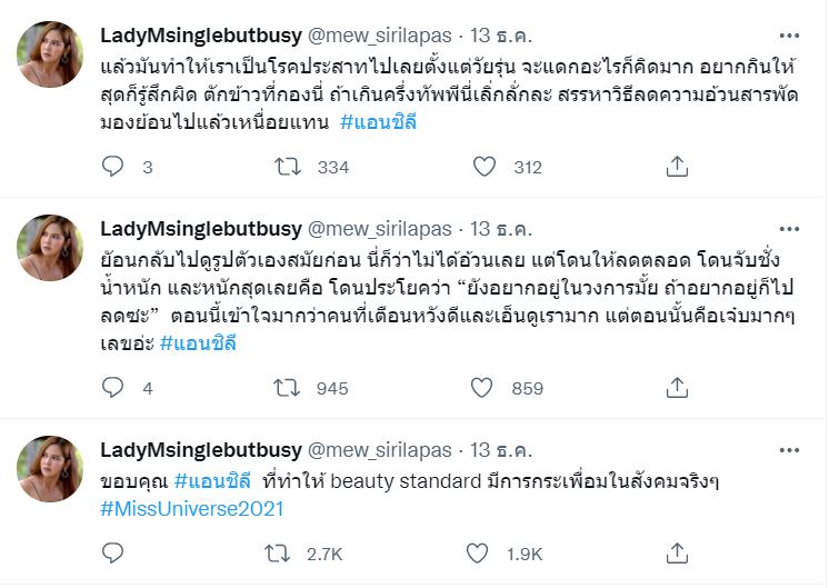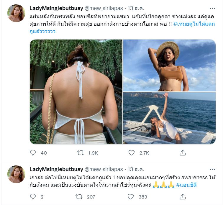 เช่นเดียวกับดาราสาว หมิว สิริลภัส ที่ได้ออกมาโพสต์ข้อความผ่านทวิตเตอร์ ขอบคุณ แอนชิลี เกี่ยวกับเรื่องนี้ พร้อมเล่าเรื่องราวในอดีตของตนเอง ที่ต้องเจอกับความยากลำบากมาไม่น้อยเพราะถูกสั่งให้ลดน้ำหนักตลอด แถมยังโดนประโยคเตือนแรง บอกว่า "ยังอยากอยู่ในวงการมั้ย ถ้าอยากอยู่ก็ไปลดซะ" โดยข้อความทั้งหมดมีดังนี้
