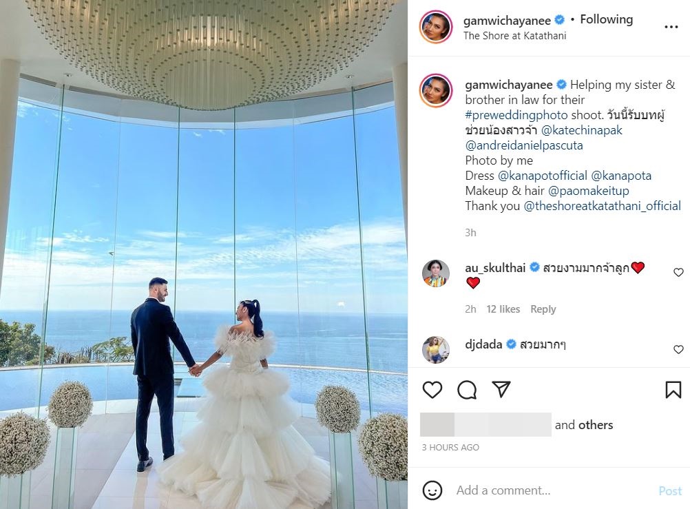 โดยสาว แก้ม เดอะสตาร์ โพสต์ IG กับแคปชั่นว่า "Helping my sister & brother in law for their #preweddingphoto shoot. วันนี้รับบทผู้ช่วยน้องสาวจ้า" พร้อมภาพของน้องสาวและแฟนหนุ่มชาวต่างชาติ ซึ่งน้องเกศ มาในชุดเจ้าสาวหวานฉ่ำ กระโปรงฟูฟ่องสุดอลัง สวยงามดุจเจ้าหญิงเลยทีเดียว