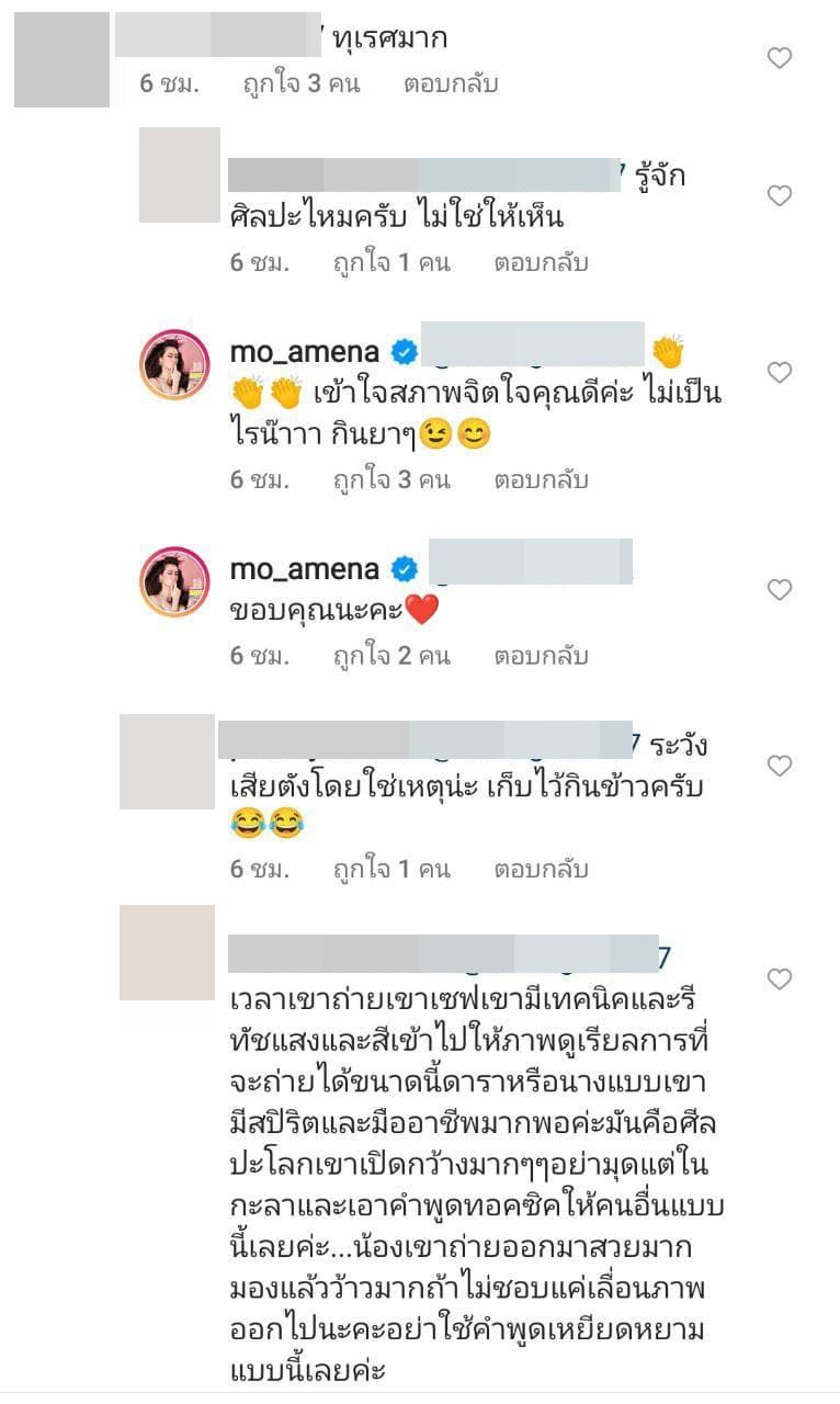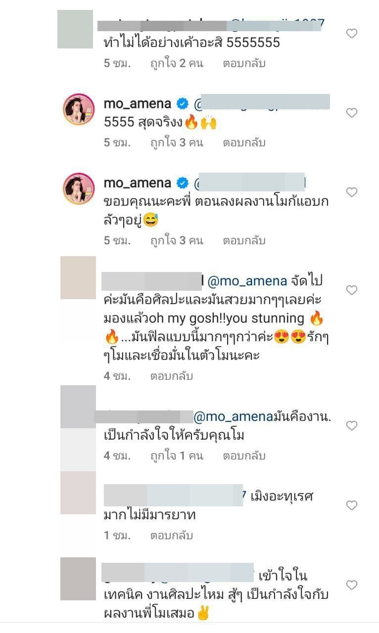 แต่งานนี้ก็กลับมีคนมาดราม่าใส่ คอมเมนต์แรงด่าว่า "ทุเรศมาก" ซึ่งสาว โม อมีนา ก็ไม่รอช้า ตอบกลับแบบนิ่ม ๆ ว่า "เข้าใจสภาพจิตใจคุณดีค่ะ ไม่เป็นไรน๊าาา กินยา ๆ"