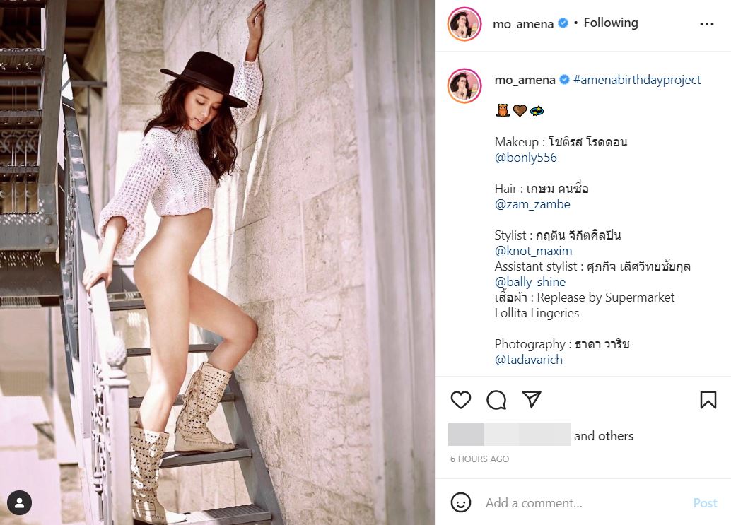ทยอยปล่อยภาพออกมาสร้างความฮือฮาได้แบบรัว ๆ สำหรับนางร้ายสาว โม อมีนา กับการสลัดผ้าถ่ายภาพนู้ดฉลองวันเกิดในโปรเจ็กต์ #Amenabirthdayproject ที่เซตล่าสุดยิ่งสร้างความร้อนแรงทั่ว IG กับชุดเสื้อไหมพรมท่อนบน กับท่อนล่างเปลือยเปล่า อวดความขาวนวลเต็ม ๆ ตา