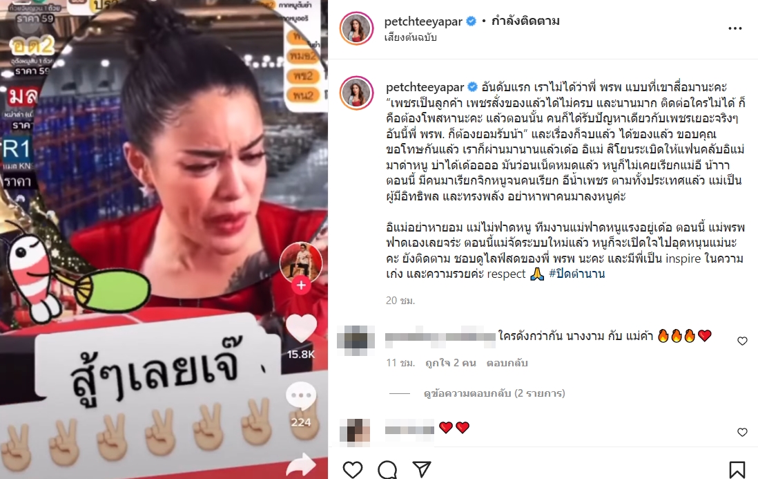 ล่าสุด (20 ธันวาคม 2564) นางงามสาว น้ำเพชร ฏีญาภาร์ ได้มีการโพสต์เรื่องนี้ด้วยว่า "อันดับแรก เราไม่ได้ว่าพี่ พรพ แบบที่เขาสื่อมานะคะ "เพชรเป็นลูกค้า เพชรสั่งของแล้วได้ไม่ครบ และนานมาก ติดต่อใครไม่ได้ ก็คือต้องโพสต์หานะคะ แล้วตอนนั้น คนก็ได้รับปัญหาเดียวกับเพชรเยอะจริง ๆ อันนี้พี่ พรพ ก็ต้องยอมรับน้า" และเรื่องก็จบแล้ว ได้ของแล้ว ขอบคุณ ขอโทษกันแล้ว