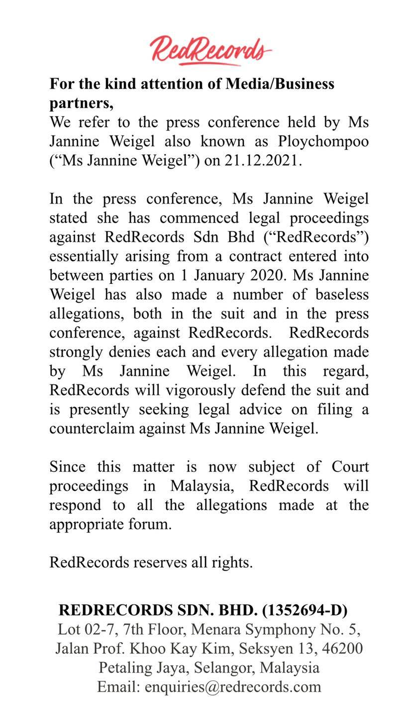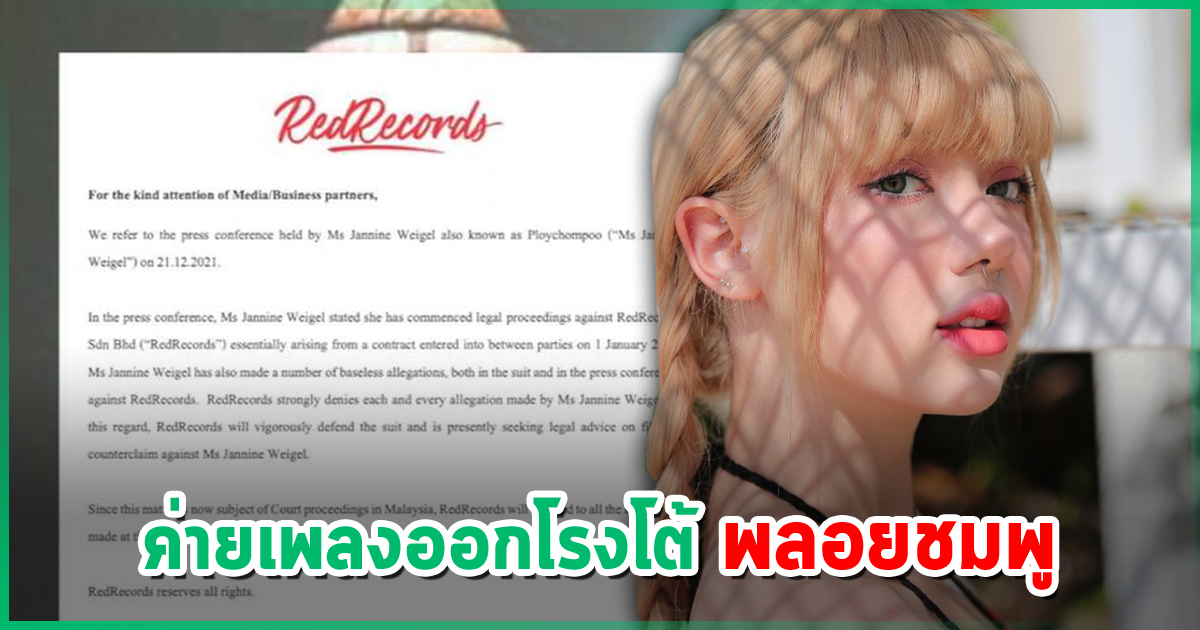 ล่าสุด (24 ธันวาคม 2564) เฟซบุ๊ก วันบันเทิง - oneบันเทิง รายงานว่า ค่ายเพลง RED RECORDS ได้ออกเอกสารถึงสื่อมวลชนในกรณีดังกล่าว โดยระบุอ้างอิงถึงกรณีที่พลอยชมพู ออกมาแถลงข่าวว่าเธอได้ดำเนินคดีต่อค่ายเพลง หรือบริษัท เรด เรคคอร์ดส จำกัด (“REDRECORDS”) ที่เกิดจากสัญญาที่มีการทำขึ้นระหว่างคู่สัญญาเมื่อวันที่ 1 มกราคม 2563