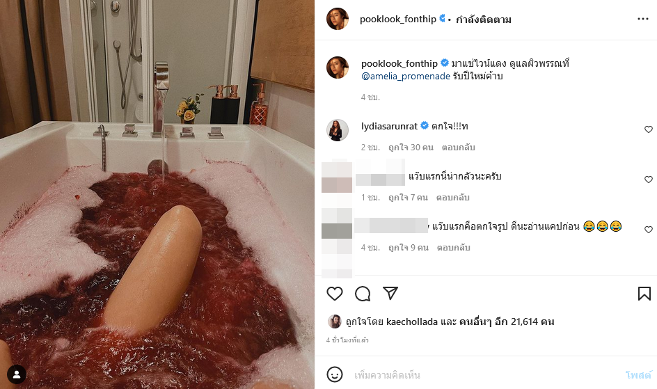 ปุ๊กลุก ฝนทิพย์ ทำแตกตื่นทั้ง IG ปล่อยภาพนอนแช่น้ำสีแดงเต็มอ่าง แฟนคลับแห่คอมเมนต์เห็นแวบแรกตกใจเลย นึกว่าเกิดอะไรขึ้น ที่แท้คือ....