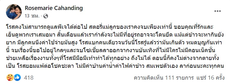 ล่าสุด (31 ธันวาคม 2564) โรสแมรี่ คาฮันดิง มีการโพสต์ข้อความผ่านทางเฟซบุ๊กอย่างน่าเป็นห่วงอีกครั้ง โดยเผยว่า ตนคงไม่สามารถดูแลลูกชาย น้องพีเจ ได้ต่อไป เรื่องราวแม่ลูกคงจบเพียงเท่านี้ สิ้นเดือนแล้วกำลังจะไม่มีที่อยู่ รถอาจจะโดนยึด แม้แต่ข้าวจะหากินยังยาก ยอมรับว่ามีลูกคนหนึ่งค่าใช้จ่ายมันสูง ตนแบกคนเดียวจนวันนี้ รู้แล้วว่ามันเกินตัว หมดบุญกันเท่านี้
