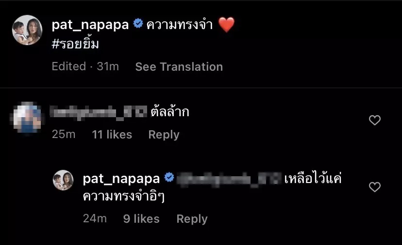 เล่นเอาแฟนคลับงุนงงไปตาม ๆ กัน สำหรับนักแสดงสาว แพท ณปภา หลังออกมาตอบคอมเมนต์ที่แฟนคลับเข้าไปเมนต์ชมความน่ารักโมเมนต์สวีตหวานกับแฟนหนุ่มดีกรีตำรวจใหญ่ นาย ณภัทร โดยมีลูกชาย น้องเรซซิ่ง ร่วมเฟรมสุดอบอุ่นว่า "เหลือไว้แค่ความทรงจำ"