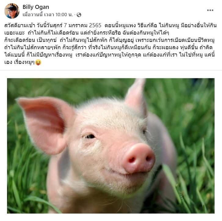บิลลี่ โอแกน โพสต์วิธีแก้ปัญหาหมูแพง บอกต้องแก้ให้ถูกจุด แก้ที่เรา ไม่ใช่ที่หมู บอกถ้าไม่กินก็ไม่เดือดร้อน คิดได้แบบนี้ก็ไม่มีปัญหา