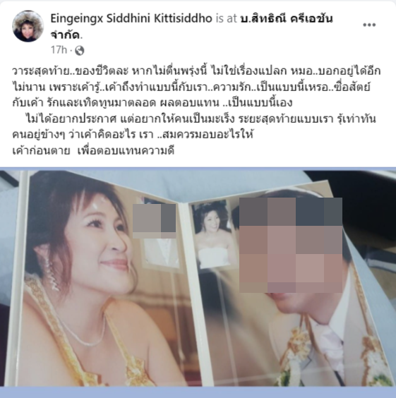อิ๋งอิ๋ง ยังบอกอีกว่า หากพรุ่งนี้ตนไม่ตื่นขึ้นมาก็ไม่แปลก ตนรักและซื่อสัตย์กับสามีมาตลอด แต่ผลตอบแทนที่ได้กลับเป็นแบบนี้ 15 ปีที่ดูแลกันมา ตนไม่เคยทำให้เขาเดือดร้อนหรือต้องทำงานนอกบ้าน จัดเงินเดือนให้เดือนละ 40,000-50,000 บาทตลอด 15 ปี มีรถให้ใช้ 2 คัน เบิกค่าล้างรถได้ เบิกค่าน้ำมันได้ ซื้อของใช้ก็เบิกได้ ค่ามือถือที่สามีใช้คุยกับหมอนวดก็เบิกได้ ตนดูแลค่าใช้จ่ายมาโดยตลอด แต่จากนี้ไป เขาต้องหาเงินใช้เอง เพราะเงินของตนที่ให้ไปนั้น เขากลับเอาไปปรนเปรอหมอนวด