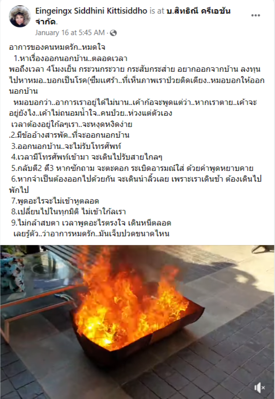 นอกจากนี้ ในวันที่ 16 มกราคม 2565 อิ๋งอิ๋งยังเผยภาพเผารูปสามีและรูปแต่งงานกองใหญ่ และบอกว่า อาการของคนหมดรัก เช่น