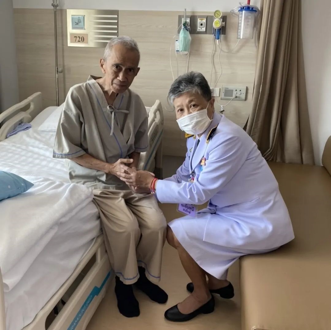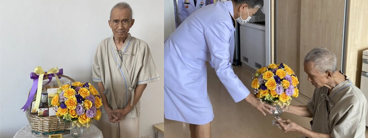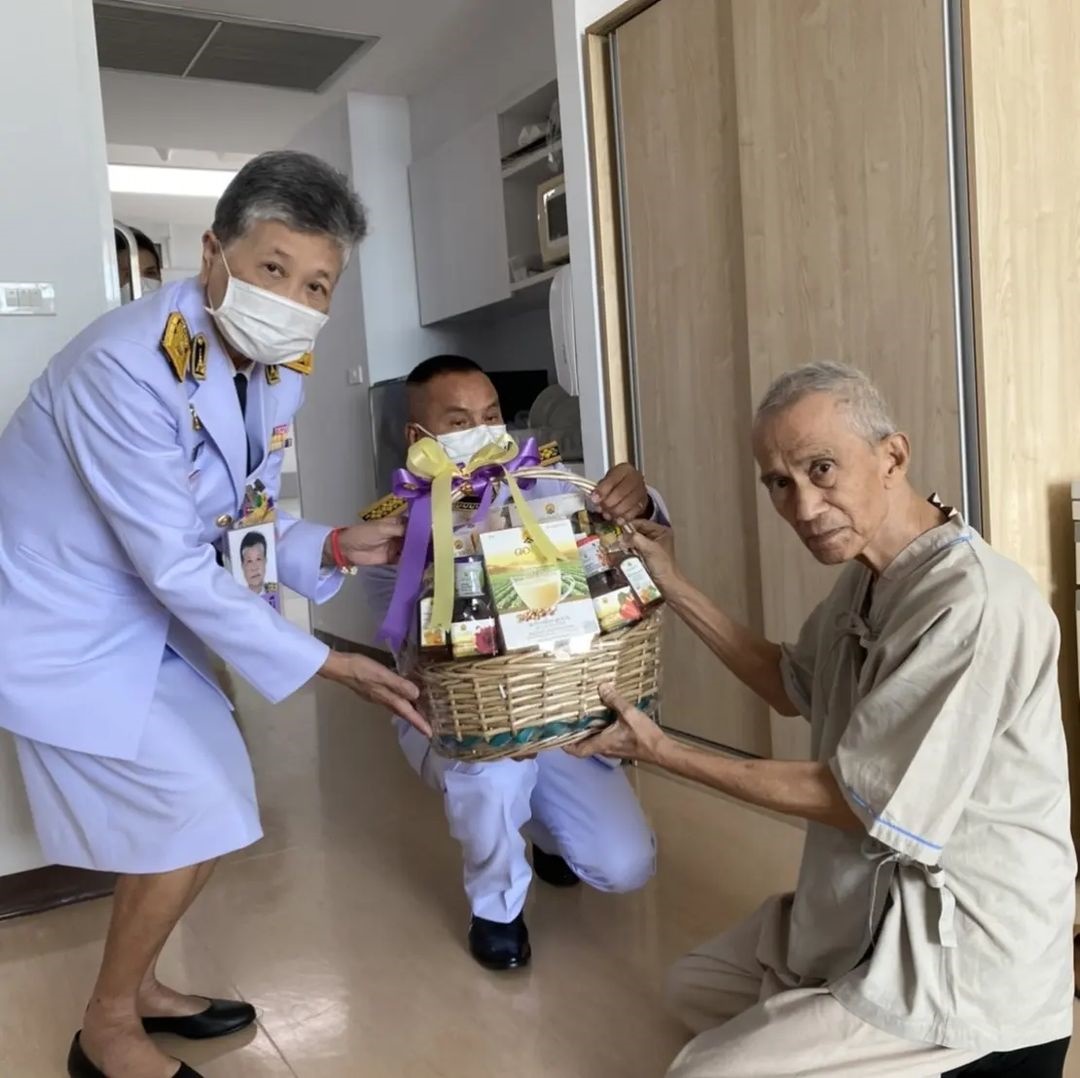 พระบาทสมเด็จพระเจ้าอยู่หัว และสมเด็จพระนางเจ้าฯ พระบรมราชินี พระราชทานแจกันดอกไม้ และกระเช้าของเยี่ยม เศรษฐา ศิระฉายา ศิลปินแห่งชาติ