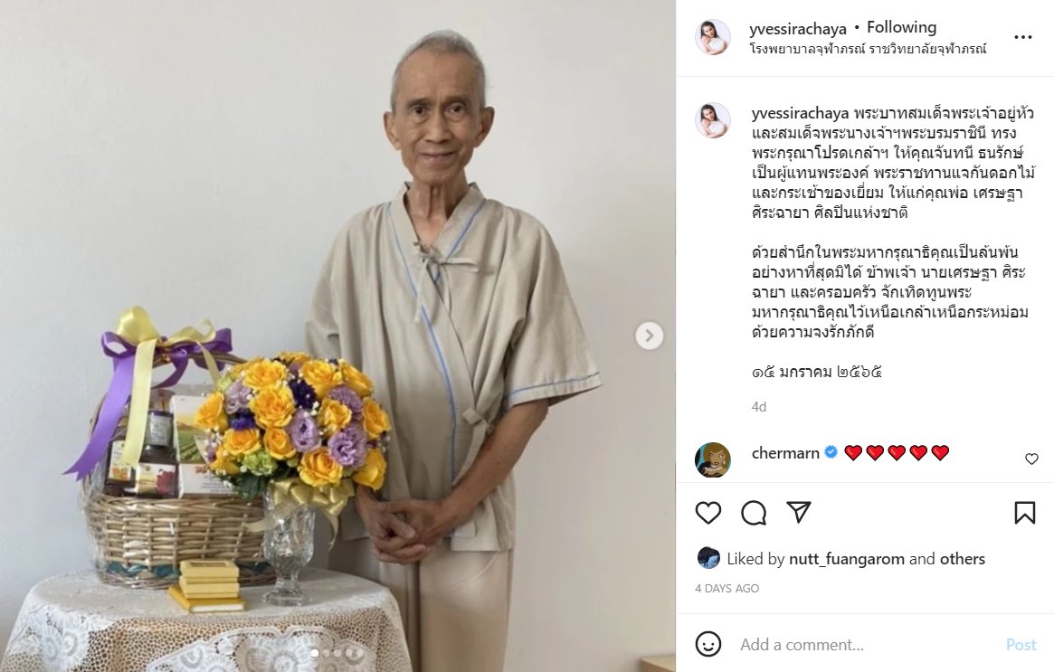 "พระบาทสมเด็จพระเจ้าอยู่หัว และสมเด็จพระนางเจ้าฯ พระบรมราชินี ทรงพระกรุณาโปรดเกล้าฯ ให้คุณจันทนี ธนรักษ์ เป็นผู้แทนพระองค์ พระราชทานแจกันดอกไม้และกระเช้าของเยี่ยม ให้แก่คุณพ่อ เศรษฐา ศิระฉายา ศิลปินแห่งชาติ
