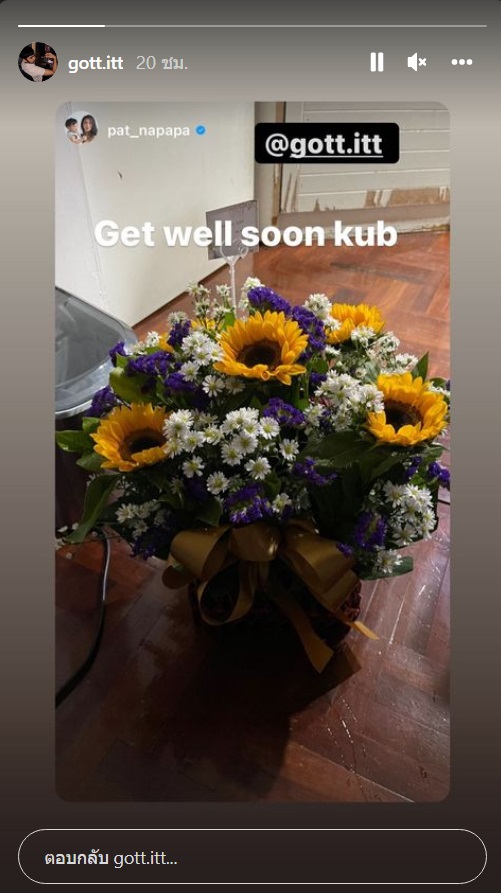 แพท ณปภา โพสต์สตอรี่ได้กระเช้าดอกไม้จาก ก๊อต อดีตแฟนหนุ่มรุ่นน้อง ส่งกำลังใจให้หลังรู้ข่าวติดโควิด 19 มิตรภาพยังดี มีแคปชั่นอวยพรภาษาอังกฤษ "Get well soon kub"