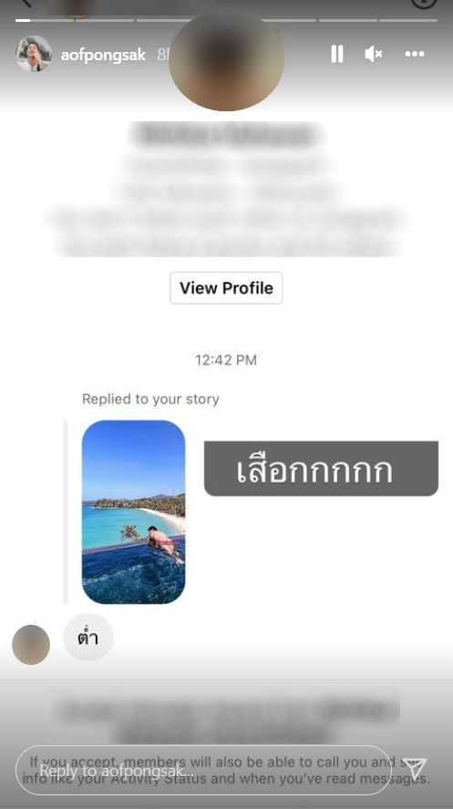 กำลังออกทริปเที่ยวทะเลอย่างสบายใจ แต่กลับมีเรื่องที่ทำให้ อ๊อฟ ปองศักดิ์ ถึงกับปรี๊ด เมื่อล่าสุด (27 มกราคม 2565) เจ้าตัวได้เผยภาพลงสตอรี่หลังมีหนุ่มคนหนึ่งทักแชตมาด่าในรูปที่อ๊อฟถ่ายภาพแซ่บ ๆ ริมสระว่ายน้ำ ระบุข้อความว่า "ต่ำ" ซึ่งอ๊อฟก็แคปภาพแชตดังกล่าวมาโพสต์ พร้อมเขียนแคปชั่นด่ากลับว่า "เสือกกกกก"