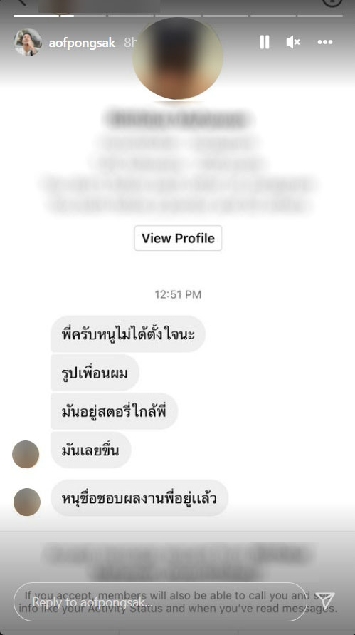 กระทั่งแชตต่อมา หนุ่มคู่กรณีที่ด่าทออ๊อฟมีท่าทีอ่อนลง พร้อมกล่าวขอโทษ ระบุว่า "พี่ครับ หนูไม่ได้ตั้งใจนะ รูปเพื่อนผมมันอยู่สตอรี่ใกล้พี่ มันเลยขึ้น หนูชื่นชอบผลงานพี่อยู่แล้ว" ซึ่งอ๊อฟก็ไม่ได้โต้ตอบอะไรกลับไปอีก