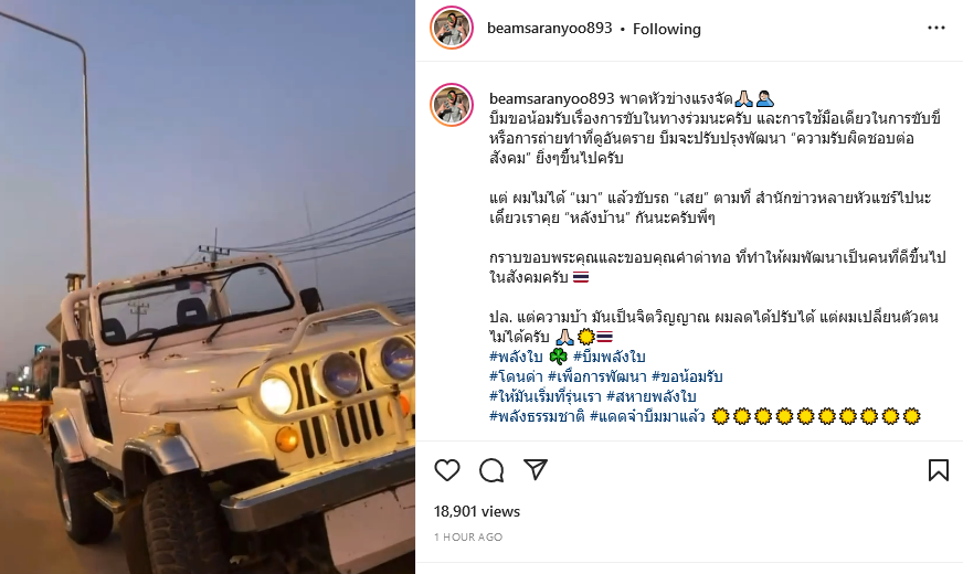 โดยบีมระบุว่า "พาดหัวข่าวแรงจัด บีมขอน้อมรับเรื่องการขับในทางร่วมนะครับ และการใช้มือเดียวในการขับขี่ หรือการถ่ายทำที่ดูอันตราย บีมจะปรับปรุงพัฒนา "ความรับผิดชอบต่อสังคม" ยิ่ง ๆ ขึ้นไปครับ