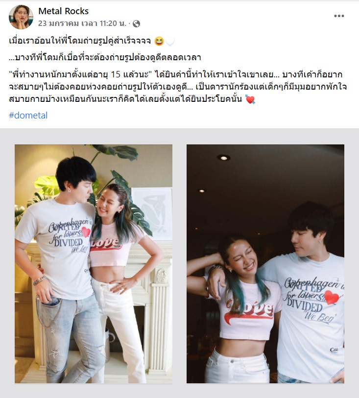 โดยเมื่อวันที่ 23 มกราคม 2565 เมทัล สุขขาว มีการโพสต์ภาพคู่กับคุณสามีเป็นโมเมนต์น่ารัก ๆ พร้อมเล่าเหตุผลที่ไม่ค่อยมีรูปคู่กันว่า "เมื่อเราอ้อนให้พี่โดมถ่ายรูปคู่สำเร็จจจจ ...บางทีพี่โดมก็เบื่อที่จะต้องถ่ายรูปต้องดูดีตลอดเวลา "พี่ทำงานหนักมาตั้งแต่อายุ 15 แล้วนะ" ได้ยินคำนี้ทำให้เราเข้าใจเขาเลย... บางทีเขาก็อยากจะสบาย ๆ ไม่ต้องคอยห่วงคอยถ่ายรูปให้ตัวเองดูดี... เป็นดารานักร้องแต่เด็ก ๆ ก็มีมุมอยากพักใจสบายกายบ้างเหมือนกันนะ เราก็คิดได้เลยตั้งแต่ได้ยินประโยคนั้น"