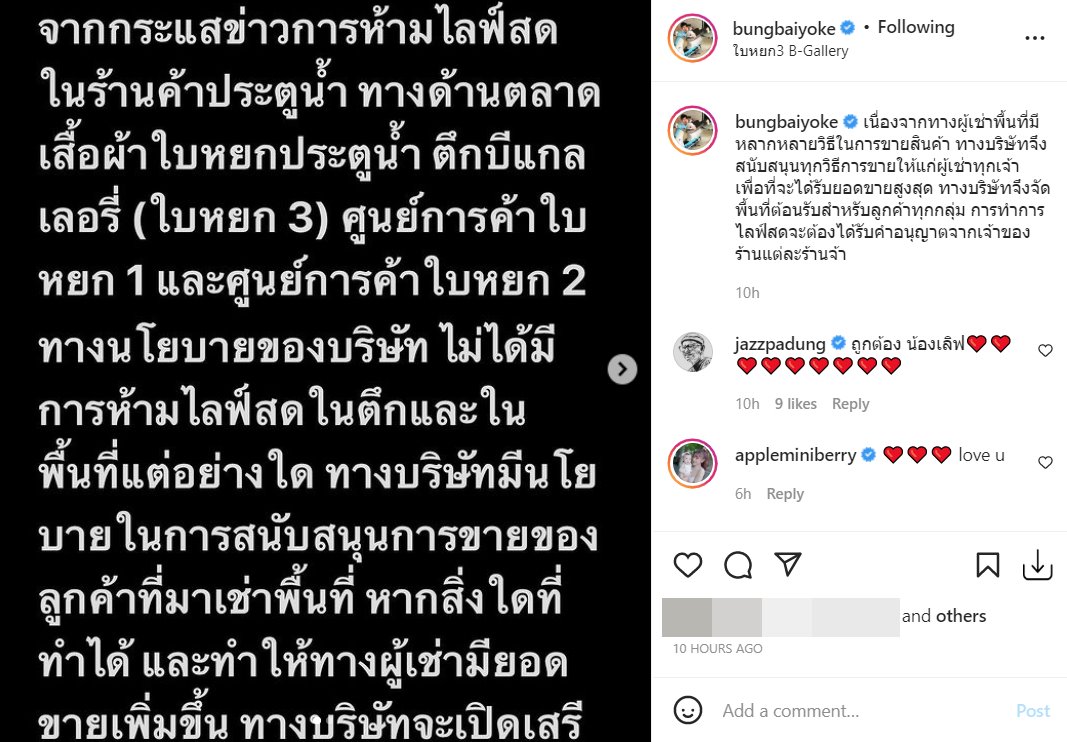 "จากกระแสข่าวการห้ามไลฟ์ ในร้านค้าประตูน้ำ ทางด้านตลาดเสื้อผ้าใบหยกประตูน้ำ ตึกบี แกลเลอรี่ (ใบหยก 3) ศูนย์การค้าใบหยก 1 และศูนย์การค้าใบหยก 2 ทางนโยบายของบริษัท ไม่ได้มีการห้ามไลฟ์ในตึกและในพื้นที่แต่อย่างใด ทางบริษัทมีนโยบายในการสนับสนุนการขายของลูกค้าที่มาเช่าพื้นที่ หากสิ่งใดที่ทําได้ และทําให้ทางผู้เช่ามียอดขายเพิ่มขึ้น ทางบริษัทจะเปิดเสรีทางการขายให้แก่ผู้เช่าในพื้นที่