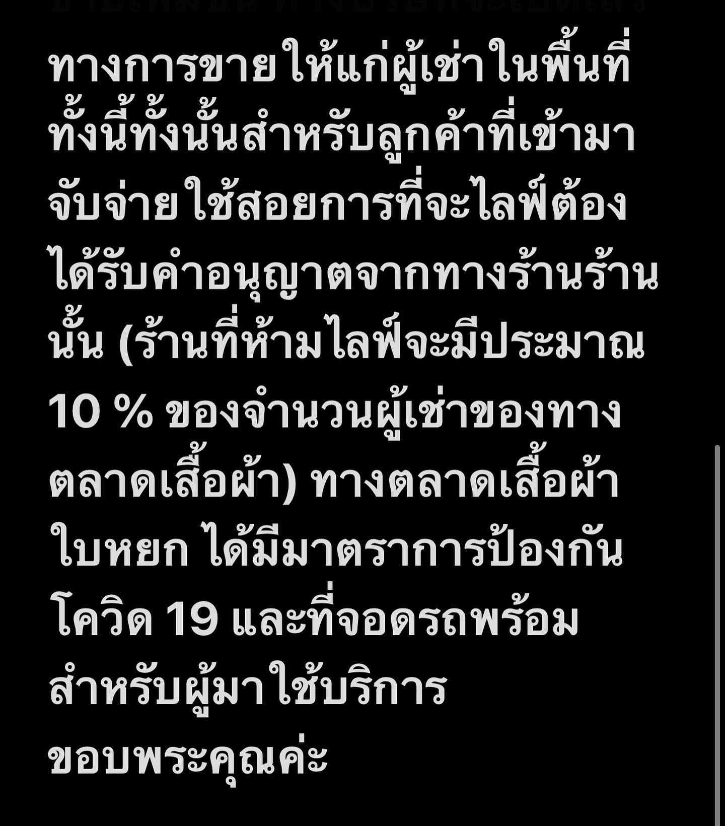 ทั้งนี้ทั้งนั้น สําหรับลูกค้าที่เข้ามาจับจ่ายใช้สอย การที่จะไลฟ์ต้องได้รับคำอนุญาตจากทางร้านร้านนั้น (ร้านที่ห้ามไลฟ์จะมีประมาณ 10% ของจำนวนผู้เช่าของทางตลาดเสื้อผ้า) ทางตลาดเสื้อผ้าใบหยก ได้มีมาตรการป้องกัน โควิด 19 และที่จอดรถพร้อมสำหรับผู้มาใช้บริการ ขอบพระคุณค่ะ"