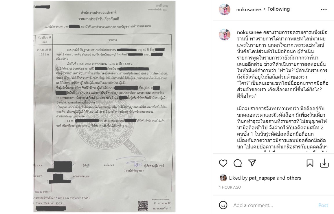 จากกรณีดาราสาว นก อุษณีย์ เห็นภาพแชตแคปจากไลน์ของตัวเองโผล่กลางรายการสด ทั้งที่ตนเองไม่ได้ส่งไป คาดว่าถูกมือดีที่รู้รหัสปลดล็อกโทรศัพท์เป็นคนแอบแคปไปปล่อย ทำให้ได้รับความเสียหาย จึงตัดสินใจเข้าแจ้งความเพื่อให้เจ้าหน้าที่ช่วยสืบหาความจริงเกี่ยวกับเรื่องนี้