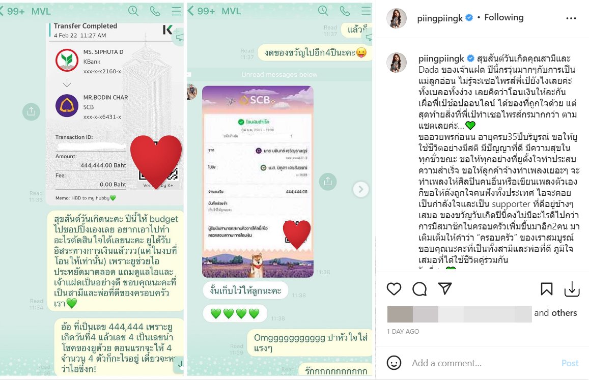 เป็นโมเมนต์น่ารัก ๆ ที่ทำเอาแฟน ๆ เห็นแล้วยิ้มตามกันเลยทีเดียว เมื่อ น้องกร ภรรยาของ เป้ วงมายด์ ได้เผยภาพแชตไลน์ตอนส่งข้อความไปอวยพรวันเกิดสามี พร้อมให้ของขวัญด้วยการโอนเงินให้ 444,444 บาท เป็นเลขสวย ไว้ให้สามีช้อปปิ้งตามใจ แล้วทิ้งท้ายแบบขำ ๆ ว่า งดของขวัญไปอีก 4 ปีนะคะ