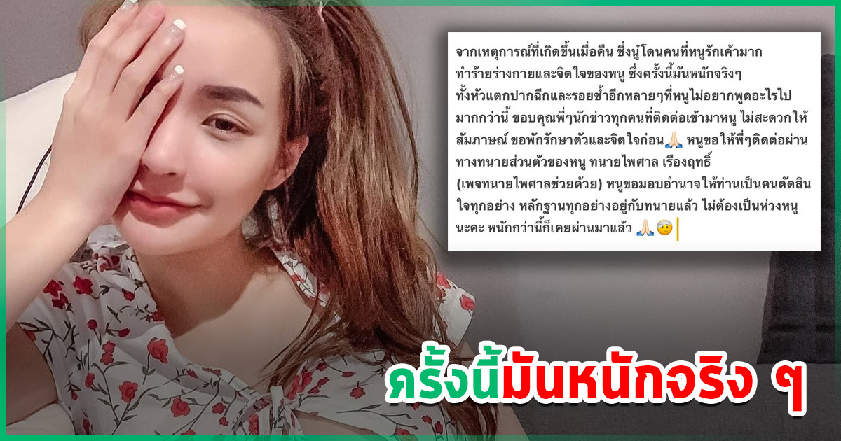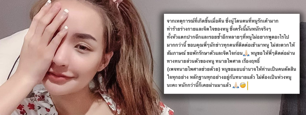 "จากเหตุการณ์ที่เกิดขึ้นเมื่อคืน ซึ่งโดนคนที่หนูรักเค้ามาก ทำร้ายร่างกายและจิตใจของหนู ซึ่งครั้งนี้มันหนักจริง ๆ ทั้งหัวแตกปากฉีกและรอยอีกหลาย ๆ ที่ หนูไม่อยากพูดอะไรไป มากกว่านี้ ขอบคุณพี่ ๆ นักข่าวทุกคนที่ติดต่อเข้ามาหนู ไม่สะดวกให้สัมภาษณ์ ขอพักรักษาตัวและจิตใจก่อน หนูขอให้พี่ ๆ ติดต่อผ่าน ทางทนายส่วนตัวของหนู ทนายไพศาล เรืองฤทธิ์ (เพจทนายไพศาลช่วยด้วย) หนูขอมอบอำนาจให้ท่านเป็นคนตัดสิน ใจทุกอย่าง หลักฐานทุกอย่างอยู่กับทนายแล้ว ไม่ต้องเป็นห่วงหนูนะคะ หนักกว่านี้ก็เคยผ่านมาแล้ว"