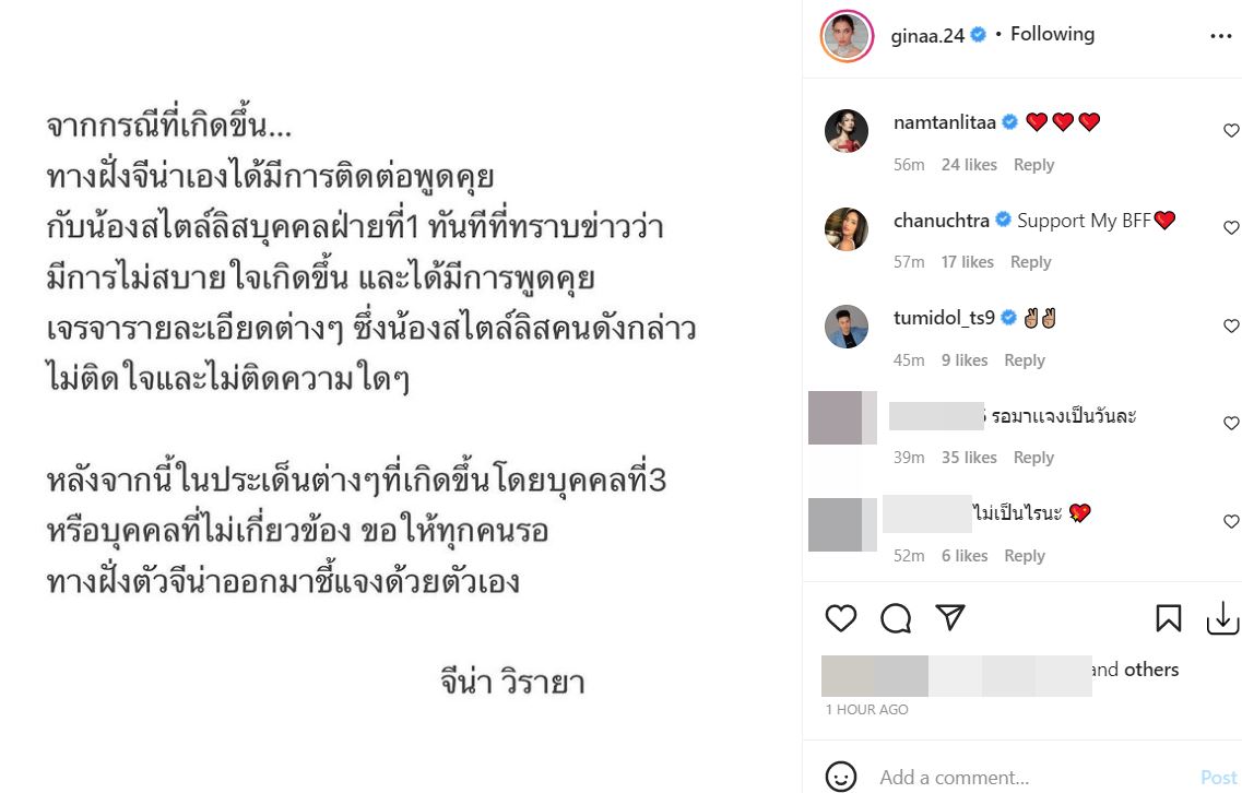 หลังจากนี้ในประเด็นต่าง ๆ ที่เกิดขึ้นโดยบุคคลที่สาม หรือบุคคลที่ไม่เกี่ยวข้อง ขอให้ทุกคนรอ ทางฝั่งตัวจีน่าออกมาชี้แจงด้วยตัวเอง"