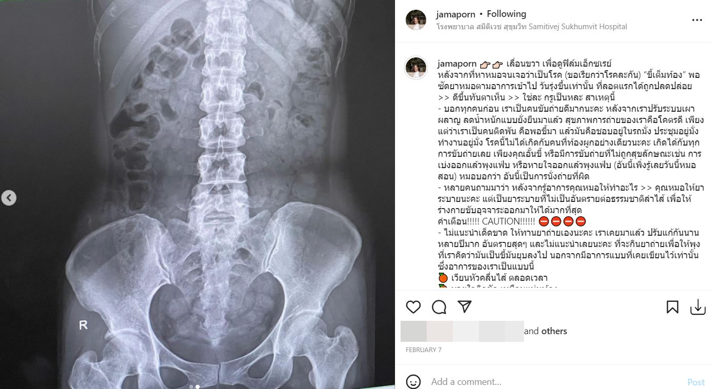 ล่าสุด (19 กุมภาพันธ์ 2565) ตุ๊กตา The Voice ก็ได้ออกมาอัปเดตอาการของตนเอง หลังรักษาโรคดังกล่าวได้ราว 1 เดือน ว่าดีขึ้นอย่างไรบ้าง พร้อมโชว์ผลเอกซเรย์ และให้ข้อมูลเพิ่มเติมจากคุณหมอเกี่ยวกับโรค "ขี้เต็มท้อง" ดังนี้