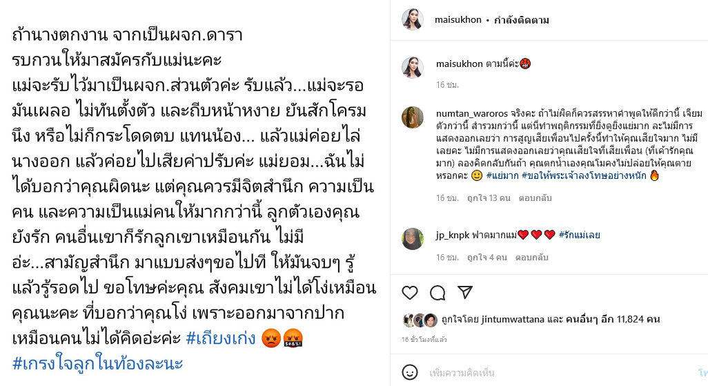 พร้อมระบุว่า "ดูคำสัมภาษณ์ที่มาขอโทษแม่ ห่านเอ้ย ! ถ้าฉันเป็นแม่นะ นั่งอยู่ตรงนั้นยันโครมไปนานละ ขนาดนั่งหน้าจอตัวยังสั่นยิก ๆ เลย อยากกระโดดถีบยอดหน้า น้ำเสียงก็ไม่ใช่แล้ว หางเสียงก็ไม่มี โตมาแบบไหน เหมือนคนไม่เคยเรียนมารยาทและเรียนหนังสือ ? คำพูดเหมือนคนไม่มีการศึกษาจริง ๆ สมองกลวงมาก อยากกระโดดตบมาก...แล้วบอกว่า อภัยไม่มีไว้ให้สำหรับคนปลอม ๆ อย่างคุณ เหมือนไม่ใช่คน ขึ้นแทน ยิ่งดูยิ่งเกลียด"